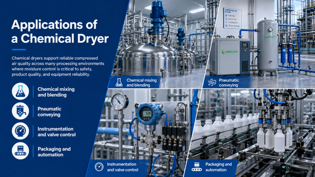 A chemical dryer can be used in many areas of chemical production and handling. It is especially valuable where compressed air comes into contact with control systems, equipment, or sensitive materials.