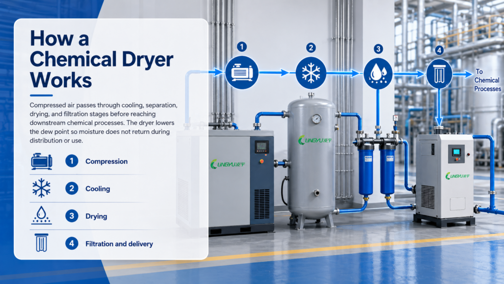 A chemical dryer works by removing water vapor from compressed air after the air leaves the compressor. The exact drying method depends on the type of dryer used, but the main purpose is always the same: to deliver clean, dry air to the process.