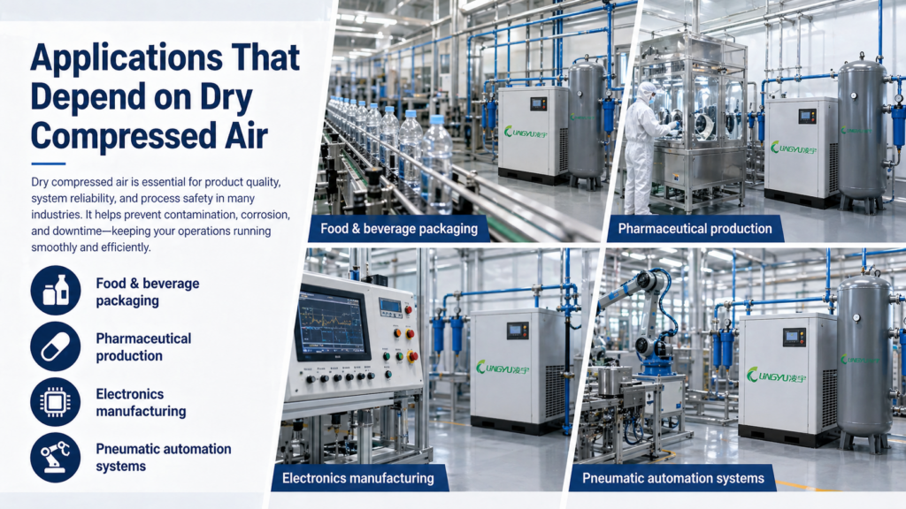 Many industries depend on reliable compressed air drying. In food and beverage plants, dry air helps reduce contamination risk and supports clean packaging processes. In pharmaceutical manufacturing, stable air quality is essential for compliance and product consistency. In electronics production, moisture control protects sensitive components and precision equipment.