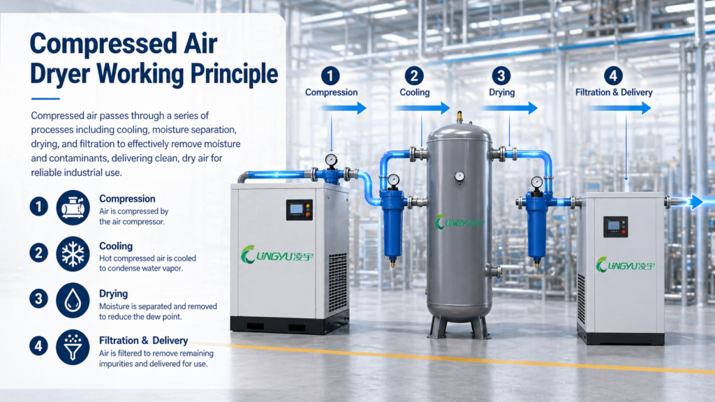 Compressed air is one of the most widely used utilities in modern industry. It powers pneumatic tools, supports automated production lines, controls valves and instruments, and helps keep many manufacturing processes running smoothly. However, compressed air naturally contains moisture, and if that moisture is not removed, it can create serious problems for equipment, product quality, and system reliability. That is why understanding compressed air dryer working principles is important for any industrial user.